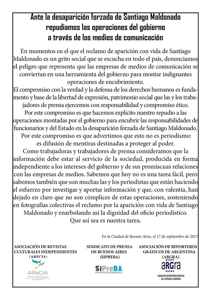 La Asociación de Revistas Culturales e Independientes de Argentina (AReCIA) abraza a la familia de Santiago Maldonado y exige respeto y prudencia. Desde el 1 de agosto no sólo han transitado el inmenso dolor que significa una desaparición forzada, sino que han sufrido la negación de esa desaparición y su posterior ocultamiento y encubrimiento. AReCIA, junto a la Asociación de Reporteros Gráficos (ArGra) y el Sindicato de Prensa de Buenos Aires (SiPreBA), fijó una posición clara de repudio respecto a las operaciones del Gobierno a través de los medios comerciales de comunicación. Volvemos a corporizar esas palabras bajo un grito que atraviesa a cada una de nuestras revistas culturales: ¡Justicia por Santiago!».